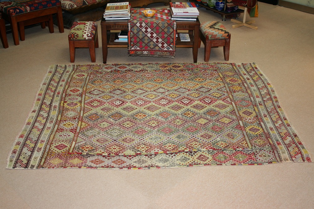 40~50年前のものです。繊細な織りと、大胆なデザインデと色彩。一枚あるだけで、オリジナリティあふれる空間をつくり出してくれます。本キリムに使用の糸は、すべて草木染めです。機械織りとは異なり、暖かみが伝わるハンドメイドです。