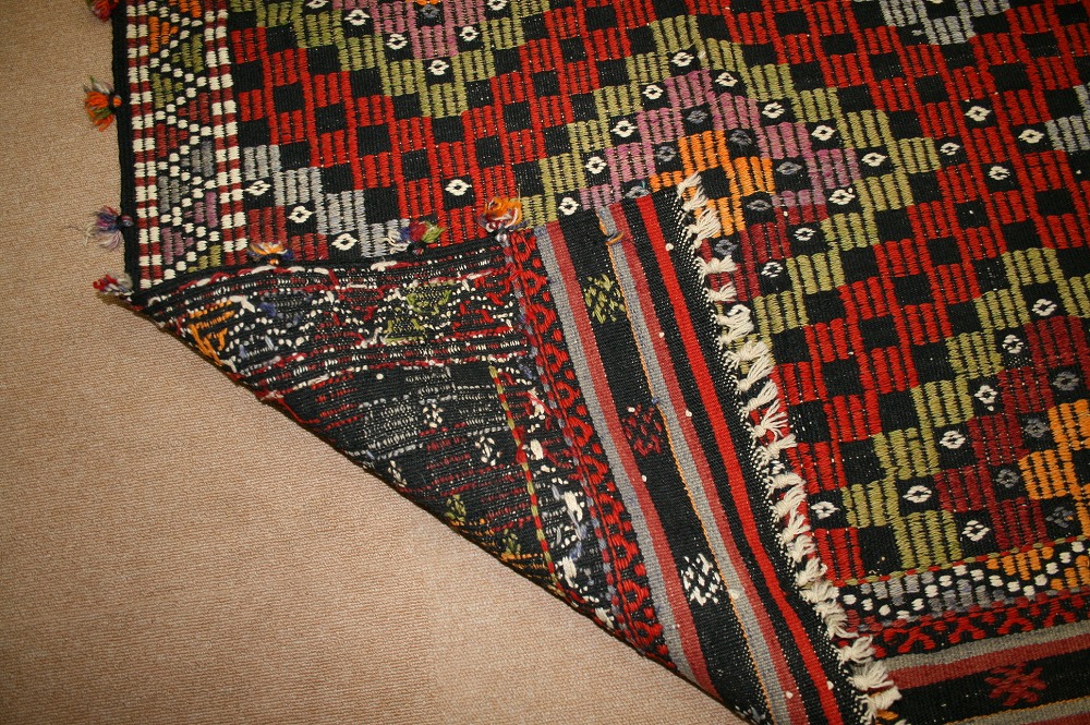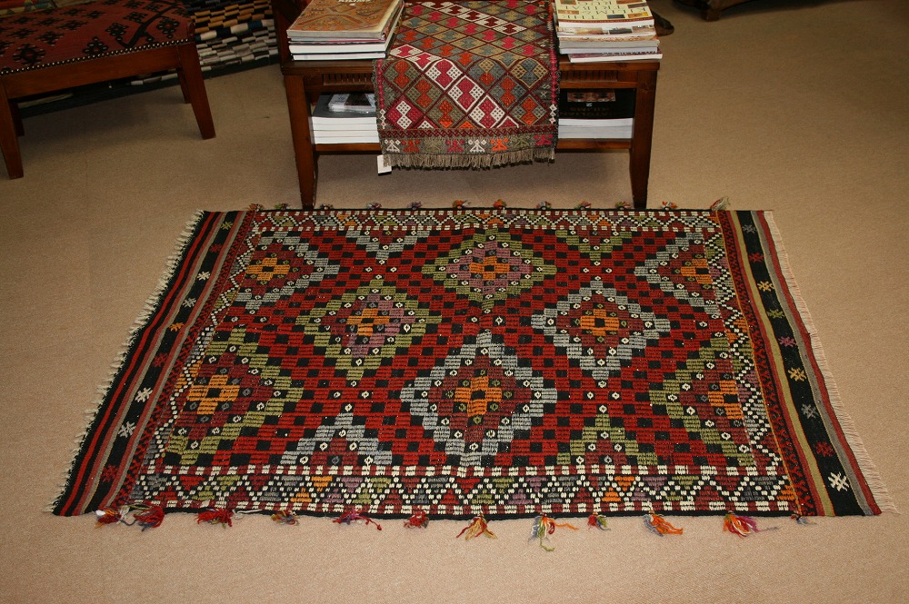 40~50年前のものです。繊細な織りと、大胆なデザインデと色彩。一枚あるだけで、オリジナリティあふれる空間をつくり出してくれます。本キリムに使用の糸は、すべて草木染めです。機械織りとは異なり、暖かみが伝わるハンドメイドです。