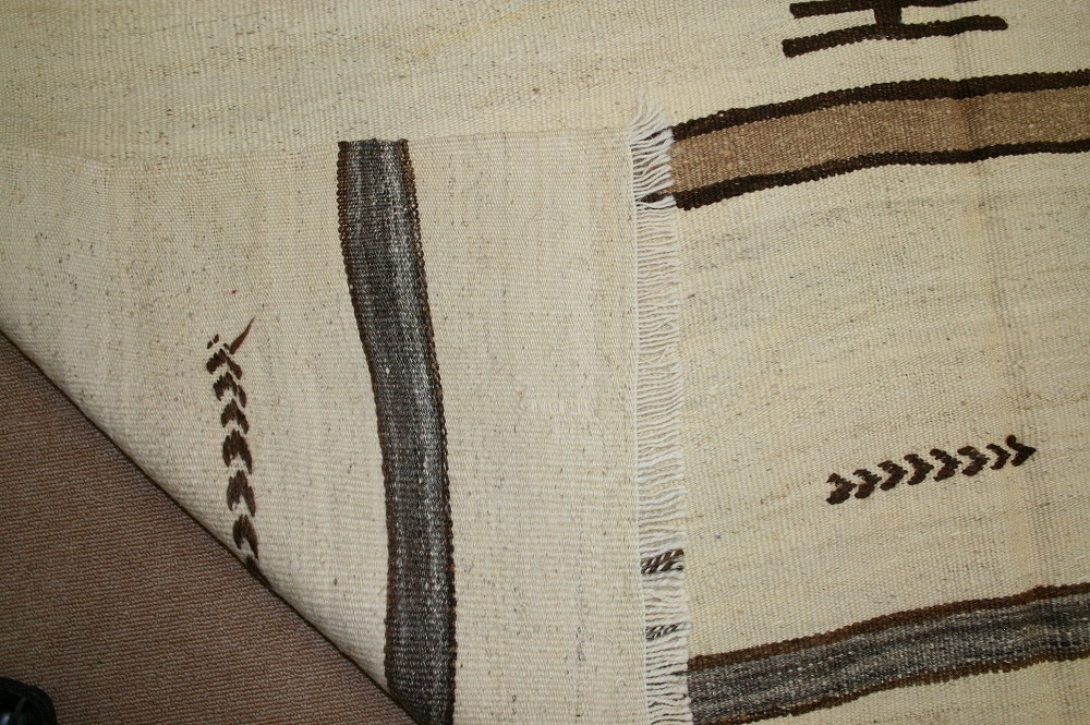 50~60年前のものです。繊細な織りと、大胆なデザインデと色彩。一枚あるだけで、オリジナリティあふれる空間をつくり出してくれます。本キリムに使用の糸は、すべて草木染めです。機械織りとは異なり、暖かみが伝わるハンドメイドです。