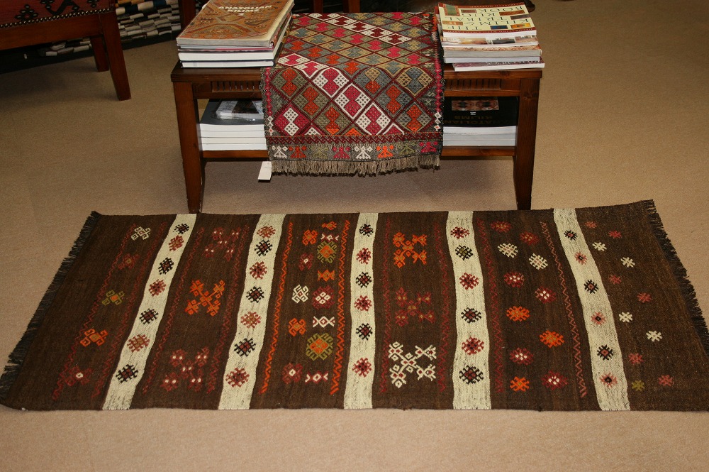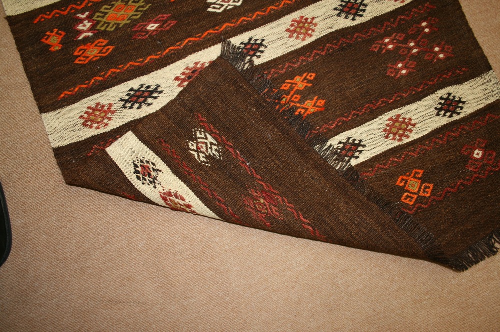 袋として使われたもので、床では使われていないため、織ってから40~50年経っていますがきれいな状態を保っています。古いキリムですので、色に味があり、手触りもやわらかくなってきています。サイズ的に壁に飾ってもいい感じです。