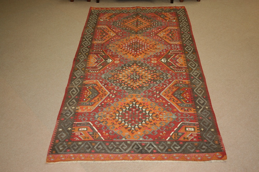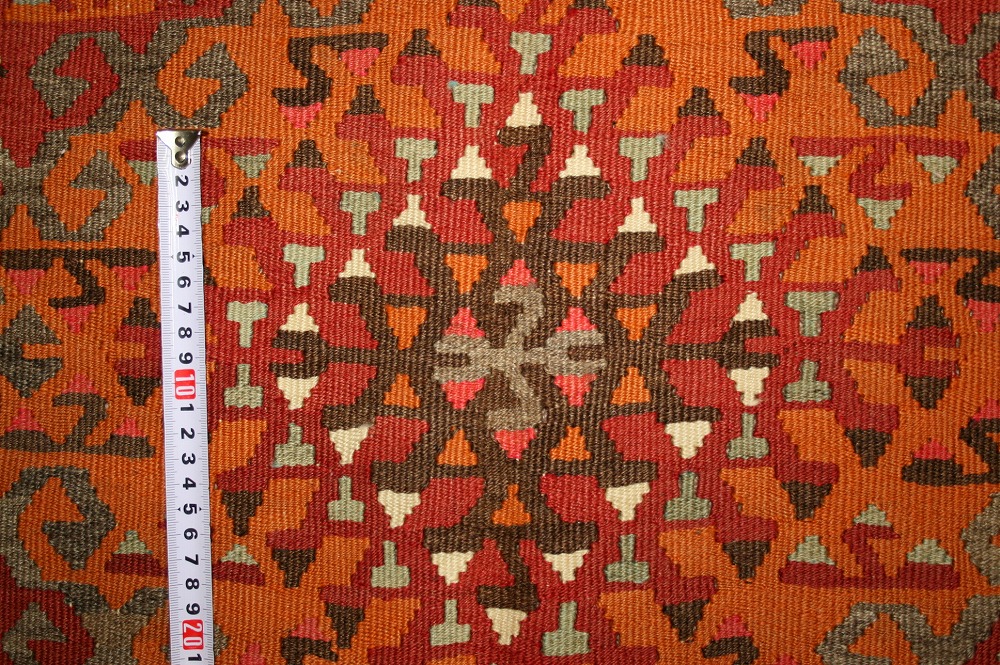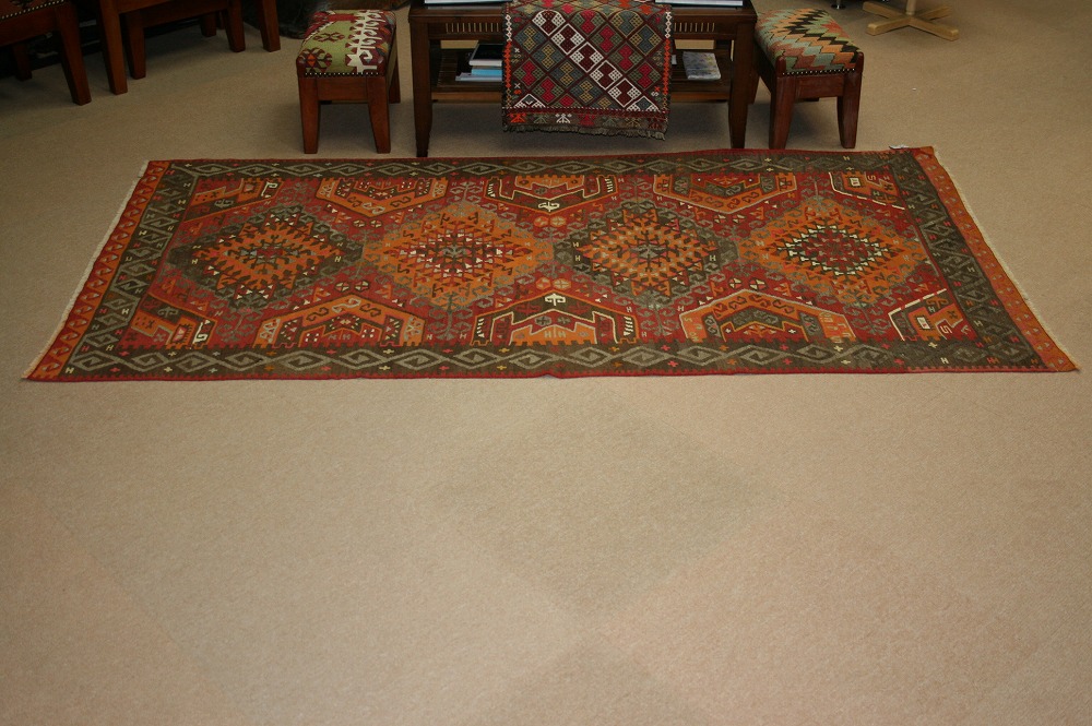 50~60年前のものです。繊細な織りと、大胆なデザインデと色彩。一枚あるだけで、オリジナリティあふれる空間をつくり出してくれます。本キリムに使用の糸は、すべて草木染めです。機械織りとは異なり、暖かみが伝わるハンドメイドです。