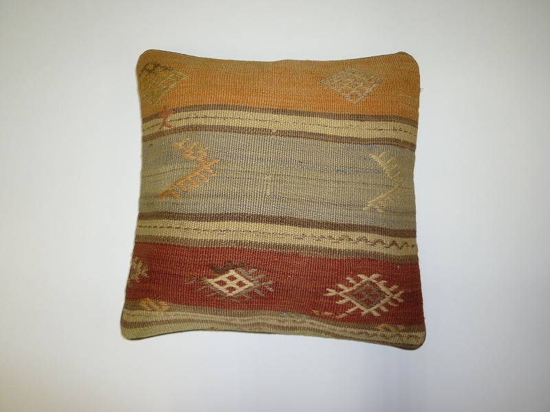 キリムクッションカバーオールドキリムを使用して作られた、エキゾチックなクッションカバー。オールドキリムの素敵な部分をカットして使用されています。(表面はオールドキリム、裏側はコットンの布地です)お手持ちの家具やキリムと組み合わせてお楽しみください。このタイプのものは、なかなか数が少な く、品質・価格・品揃え共に日本国内屈指であると自負しています。この商品は現地でクリーニングしてから輸入していますのでご安心ください。