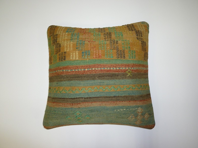 キリムクッションカバーオールドキリムを使用して作られた、エキゾチックなクッションカバー。オールドキリムの素敵な部分をカットして使用されています。(表面はオールドキリム、裏側はコットンの布地です)お手持ちの家具やキリムと組み合わせてお楽しみください。このタイプのものは、なかなか数が少な く、品質・価格・品揃え共に日本国内屈指であると自負しています。この商品は現地でクリーニングしてから輸入していますのでご安心ください。