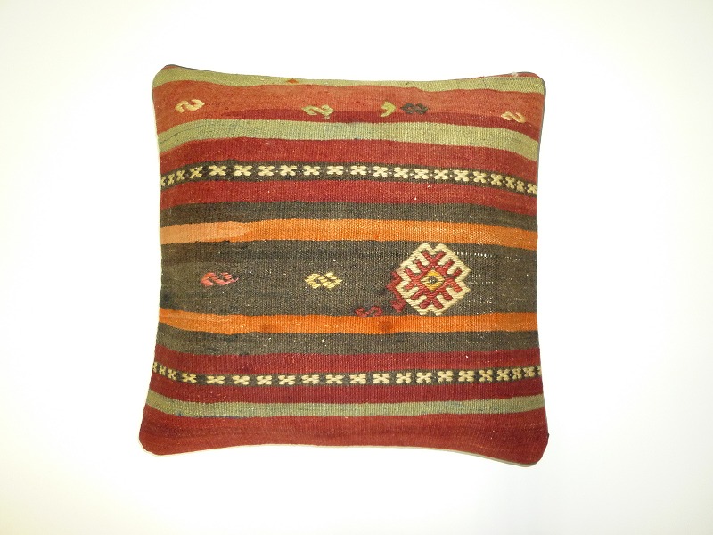 キリムクッションカバーオールドキリムを使用して作られた、エキゾチックなクッションカバー。オールドキリムの素敵な部分をカットして使用されています。(表面はオールドキリム、裏側はコットンの布地です)お手持ちの家具やキリムと組み合わせてお楽しみください。このタイプのものは、なかなか数が少な く、品質・価格・品揃え共に日本国内屈指であると自負しています。この商品は現地でクリーニングしてから輸入していますのでご安心ください。