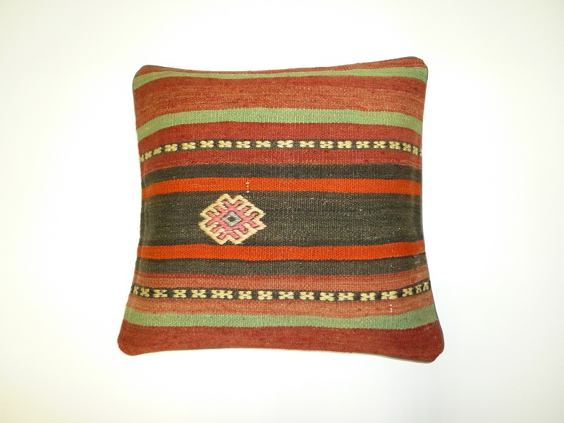 キリムクッションカバーオールドキリムを使用して作られた、エキゾチックなクッションカバー。オールドキリムの素敵な部分をカットして使用されています。(表面はオールドキリム、裏側はコットンの布地です)お手持ちの家具やキリムと組み合わせてお楽しみください。このタイプのものは、なかなか数が少な く、品質・価格・品揃え共に日本国内屈指であると自負しています。この商品は現地でクリーニングしてから輸入していますのでご安心ください。