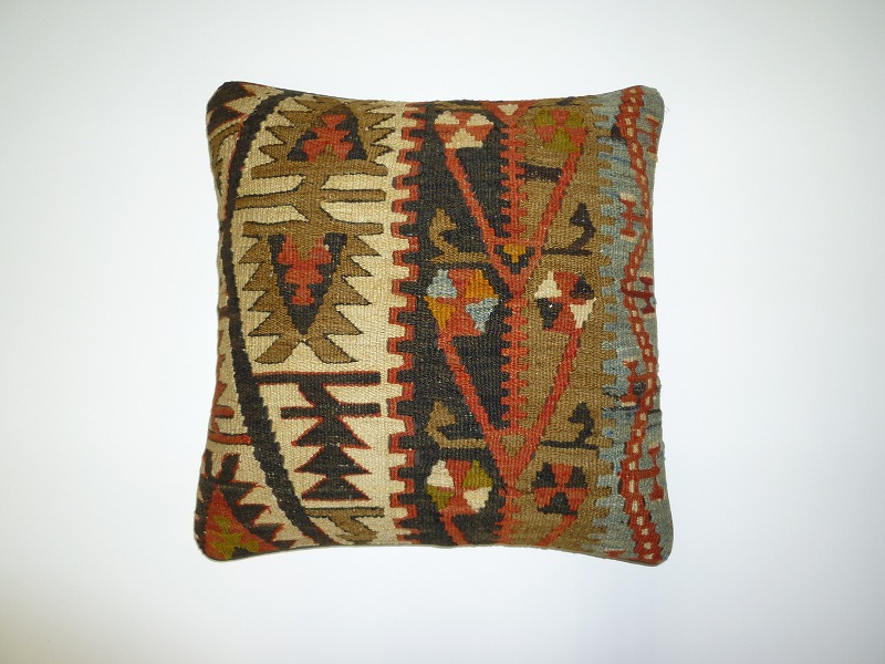 キリムクッションカバーオールドキリムを使用して作られた、エキゾチックなクッションカバー。オールドキリムの素敵な部分をカットして使用されています。(表面はオールドキリム、裏側はコットンの布地です)お手持ちの家具やキリムと組み合わせてお楽しみください。このタイプのものは、なかなか数が少な く、品質・価格・品揃え共に日本国内屈指であると自負しています。この商品は現地でクリーニングしてから輸入していますのでご安心ください。