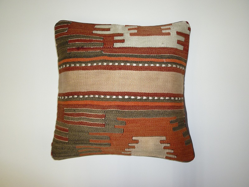 キリムクッションカバーオールドキリムを使用して作られた、エキゾチックなクッションカバー。オールドキリムの素敵な部分をカットして使用されています。(表面はオールドキリム、裏側はコットンの布地です)お手持ちの家具やキリムと組み合わせてお楽しみください。このタイプのものは、なかなか数が少な く、品質・価格・品揃え共に日本国内屈指であると自負しています。この商品は現地でクリーニングしてから輸入していますのでご安心ください。