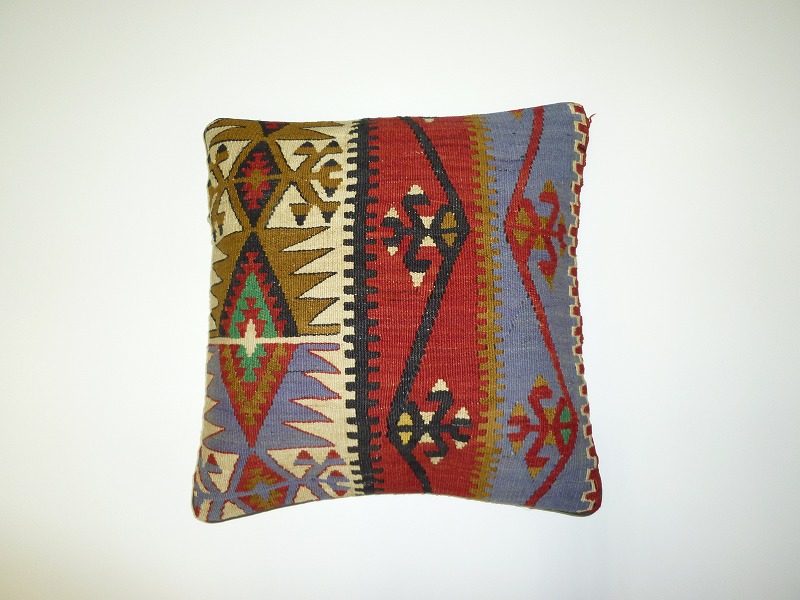 キリムクッションカバーオールドキリムを使用して作られた、エキゾチックなクッションカバー。オールドキリムの素敵な部分をカットして使用されています。(表面はオールドキリム、裏側はコットンの布地です)お手持ちの家具やキリムと組み合わせてお楽しみください。このタイプのものは、なかなか数が少な く、品質・価格・品揃え共に日本国内屈指であると自負しています。この商品は現地でクリーニングしてから輸入していますのでご安心ください。