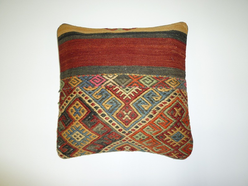 キリムクッションカバーオールドキリムを使用して作られた、エキゾチックなクッションカバー。オールドキリムの素敵な部分をカットして使用されています。(表面はオールドキリム、裏側はコットンの布地です)お手持ちの家具やキリムと組み合わせてお楽しみください。このタイプのものは、なかなか数が少な く、品質・価格・品揃え共に日本国内屈指であると自負しています。この商品は現地でクリーニングしてから輸入していますのでご安心ください。