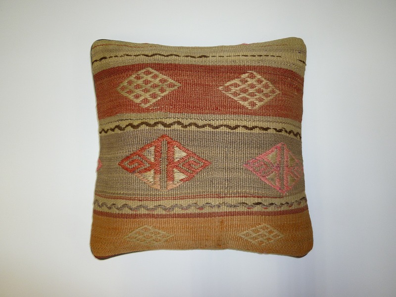 キリムクッションカバーオールドキリムを使用して作られた、エキゾチックなクッションカバー。オールドキリムの素敵な部分をカットして使用されています。(表面はオールドキリム、裏側はコットンの布地です)お手持ちの家具やキリムと組み合わせてお楽しみください。このタイプのものは、なかなか数が少な く、品質・価格・品揃え共に日本国内屈指であると自負しています。この商品は現地でクリーニングしてから輸入していますのでご安心ください。