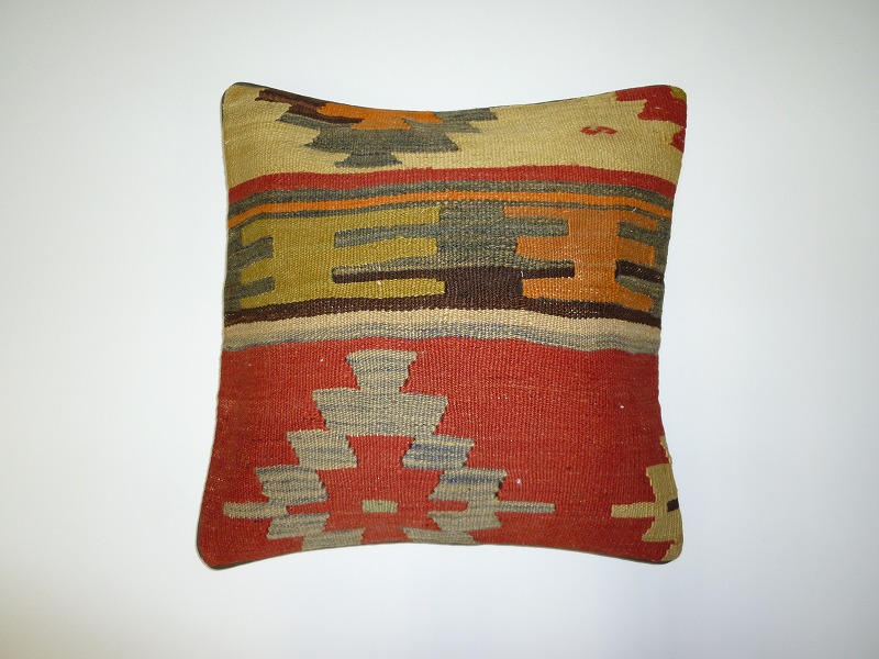 キリムクッションカバーオールドキリムを使用して作られた、エキゾチックなクッションカバー。オールドキリムの素敵な部分をカットして使用されています。(表面はオールドキリム、裏側はコットンの布地です)お手持ちの家具やキリムと組み合わせてお楽しみください。このタイプのものは、なかなか数が少な く、品質・価格・品揃え共に日本国内屈指であると自負しています。この商品は現地でクリーニングしてから輸入していますのでご安心ください。