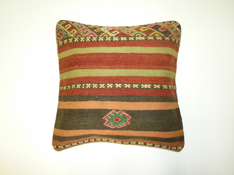 キリムクッションカバーオールドキリムを使用して作られた、エキゾチックなクッションカバー。オールドキリムの素敵な部分をカットして使用されています。(表面はオールドキリム、裏側はコットンの布地です)お手持ちの家具やキリムと組み合わせてお楽しみください。このタイプのものは、なかなか数が少な く、品質・価格・品揃え共に日本国内屈指であると自負しています。