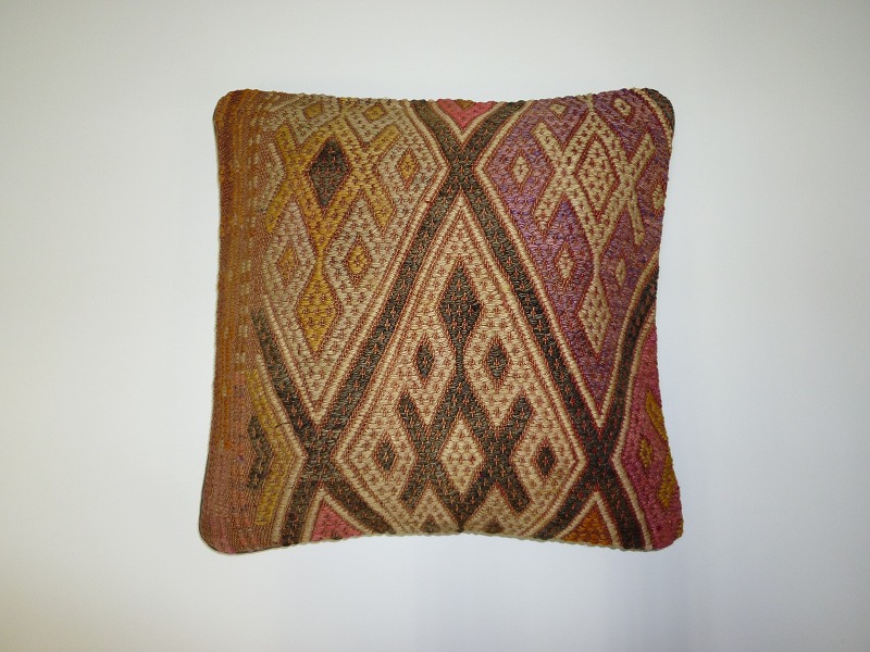 キリムクッションカバーオールドキリムを使用して作られた、エキゾチックなクッションカバー。オールドキリムの素敵な部分をカットして使用されています。(表面はオールドキリム、裏側はコットンの布地です)お手持ちの家具やキリムと組み合わせてお楽しみください。このタイプのものは、なかなか数が少な く、品質・価格・品揃え共に日本国内屈指であると自負しています。この商品は現地でクリーニングしてから輸入していますのでご安心ください。