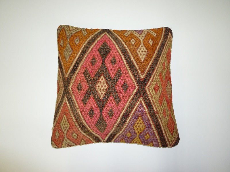 キリムクッションカバーオールドキリムを使用して作られた、エキゾチックなクッションカバー。オールドキリムの素敵な部分をカットして使用されています。(表面はオールドキリム、裏側はコットンの布地です)お手持ちの家具やキリムと組み合わせてお楽しみください。このタイプのものは、なかなか数が少な く、品質・価格・品揃え共に日本国内屈指であると自負しています。この商品は現地でクリーニングしてから輸入していますのでご安心ください。