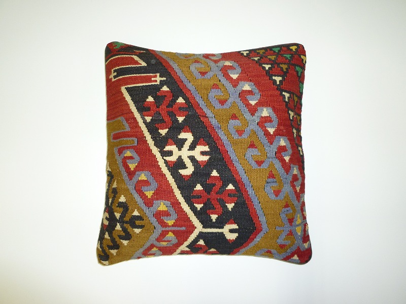 キリムクッションカバーオールドキリムを使用して作られた、エキゾチックなクッションカバー。オールドキリムの素敵な部分をカットして使用されています。(表面はオールドキリム、裏側はコットンの布地です)お手持ちの家具やキリムと組み合わせてお楽しみください。このタイプのものは、なかなか数が少な く、品質・価格・品揃え共に日本国内屈指であると自負しています。この商品は現地でクリーニングしてから輸入していますのでご安心ください。