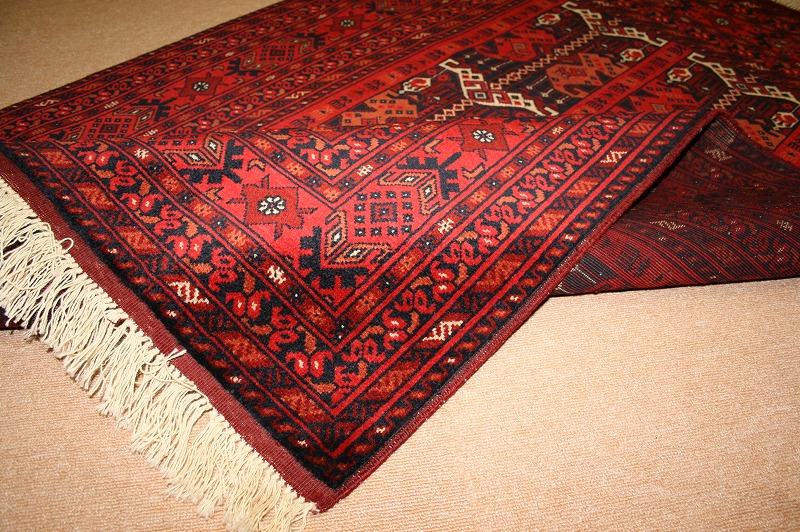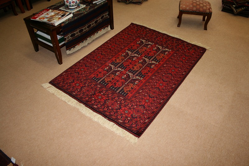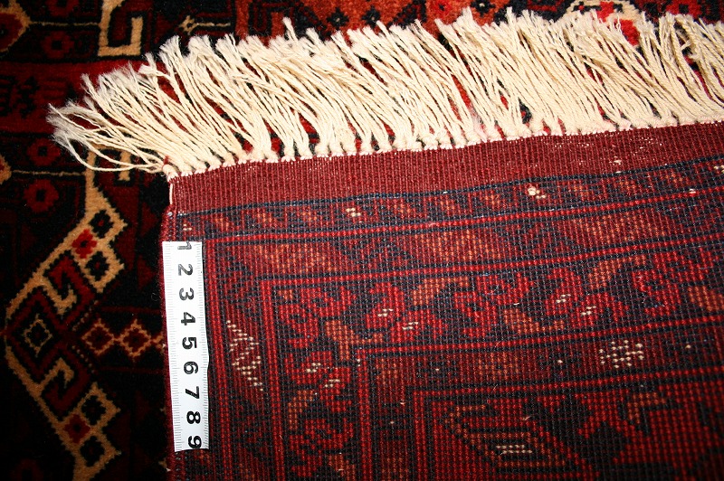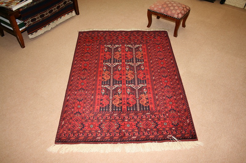 [hal07]アフガニスタンのビリジックの絨毯です。織りはとても細かく、目が詰まっており、しっかりとしています。1㎠あたりおよそ36個の結び目があります。ウールがとても柔らかく、シルクのような手触りと光沢があります。