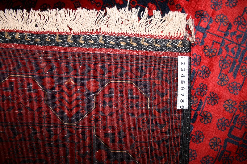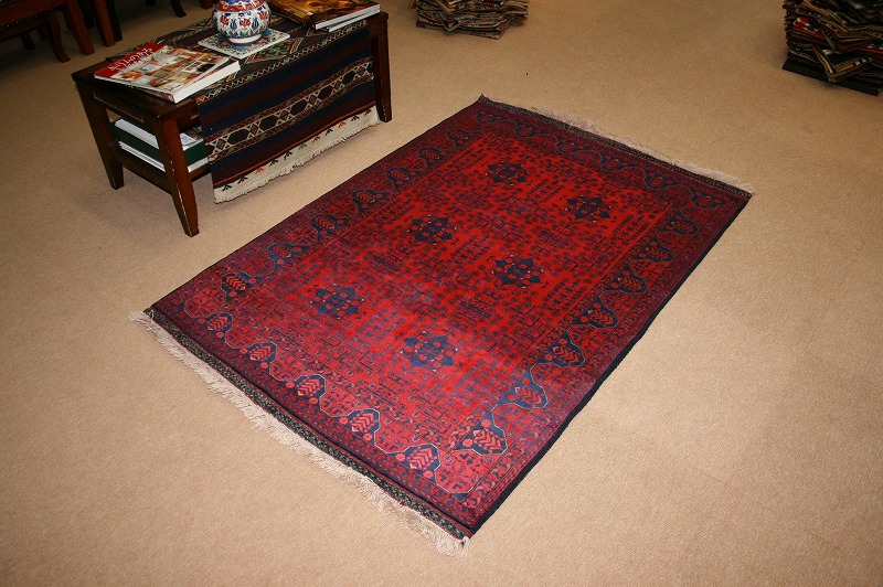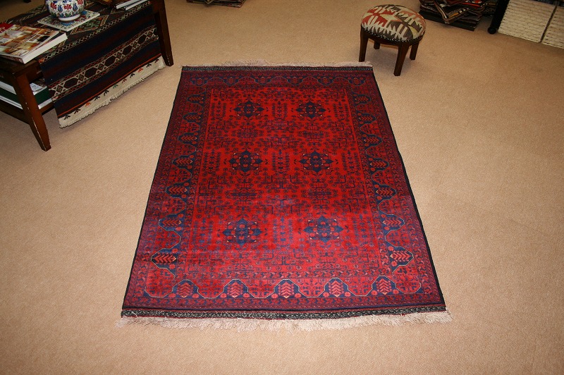 [hal22]アフガニスタンのビリジックの絨毯です。織りはとても細かく、目が詰まっており、しっかりとしています。1㎠あたりおよそ36個の結び目があります。ウールがとても柔らかく、シルクのような手触りと光沢があります。