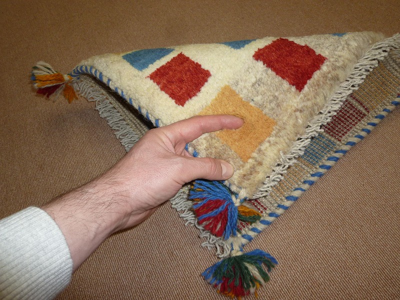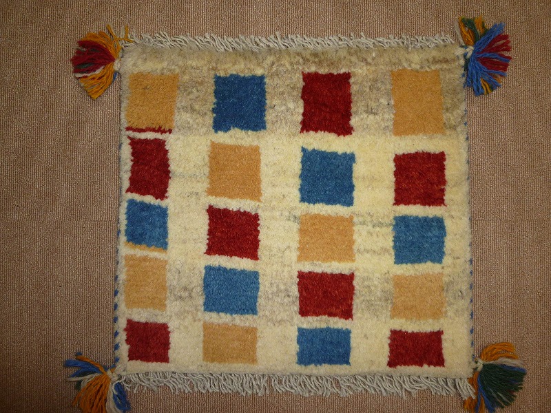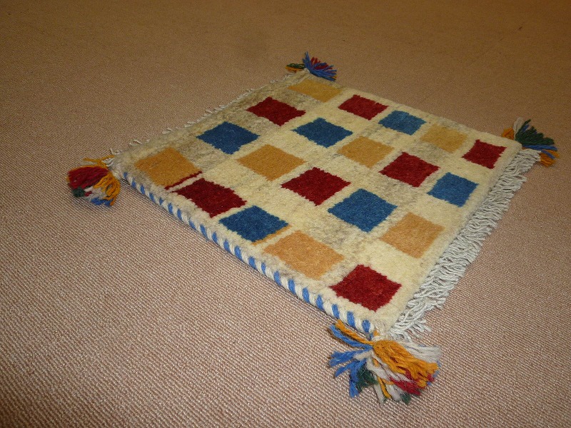 ふわふわした毛足(パイル)で、手触りがいい手紬で手織りのギャッベ。40cm角のミニサイズは、玄関、ダイニングや普段座る椅子、車の座席の座布団代わりにおすすめです。手織りならではの一枚一枚違った感触をお楽しみください。