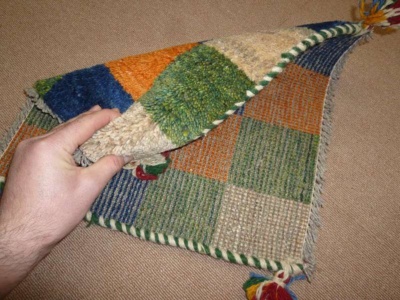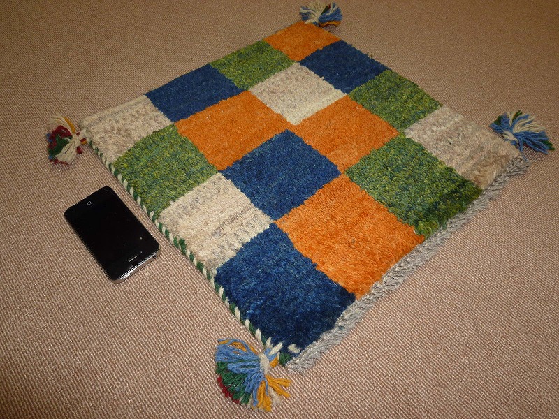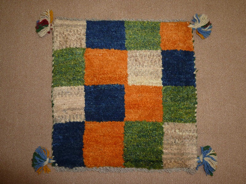 ふわふわした毛足(パイル)で、手触りがいい手紬で手織りのギャッベ。40cm角のミニサイズは、玄関、ダイニングや普段座る椅子、車の座席の座布団代わりにおすすめです。手織りならではの一枚一枚違った感触をお楽しみください。