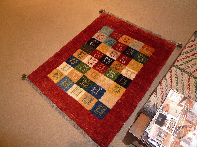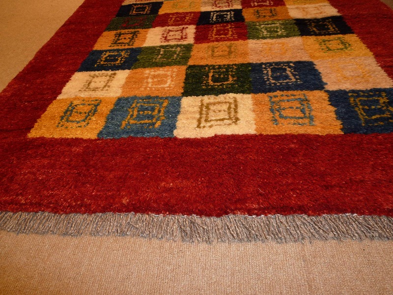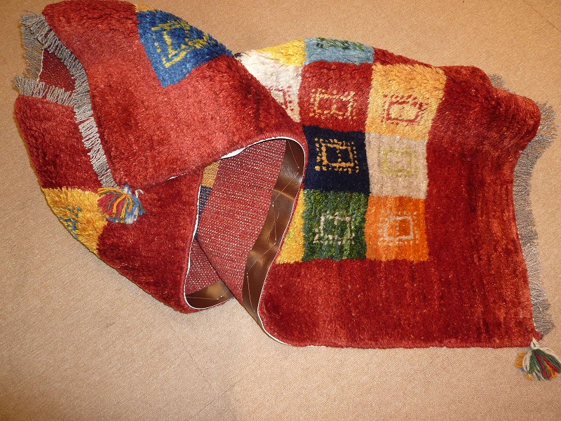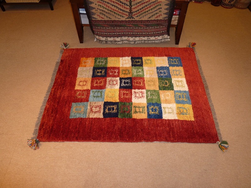 igb2111手織り-手紡-草木染め,ギャッベ絨毯とは、イランの遊牧民の女性たちが織るウール100%の手織りの草木染絨毯です。ギャッベ(Gabbeh)は2センチ約の長い毛足を持つ分厚い絨毯のことを指します。100%天然素材ですので、べとつくことなくサラッとし、1年を通して使っていただけます。こちらのサイズは、玄関マットや、ベットの脇や、ソファーの前など、幅広く使っていただけます。