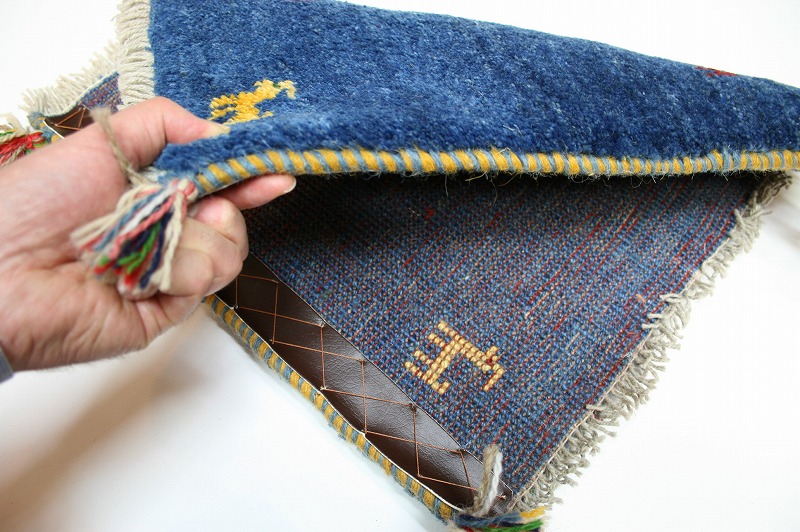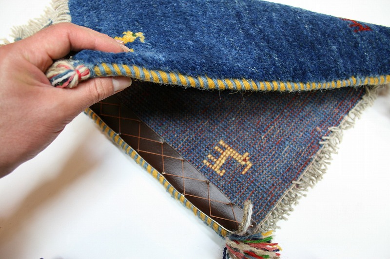 igm10=ふわふわした毛足(パイル)で、手触りがいい手紬で手織りのギャッベ。40cm角のミニサイズは、玄関、ダイニングや普段座る椅子、車の座席の座布団代わりにおすすめです。手織りならではの一枚一枚違った感触をお楽しみください。