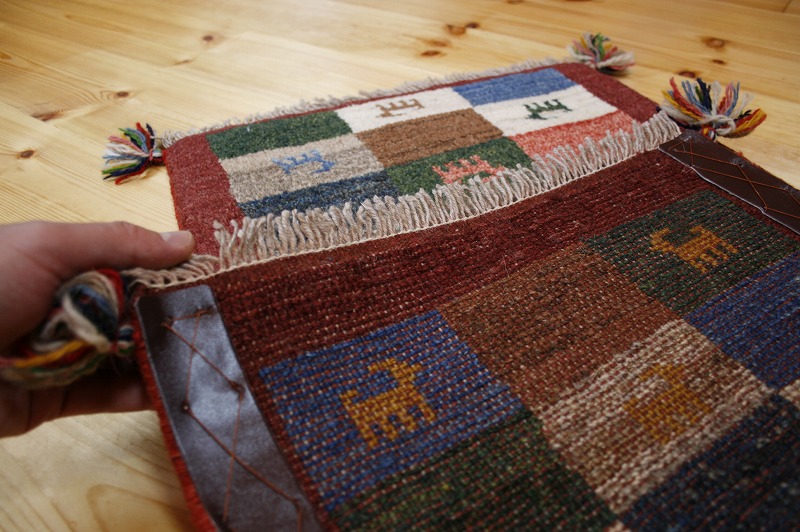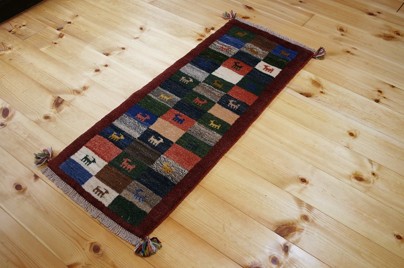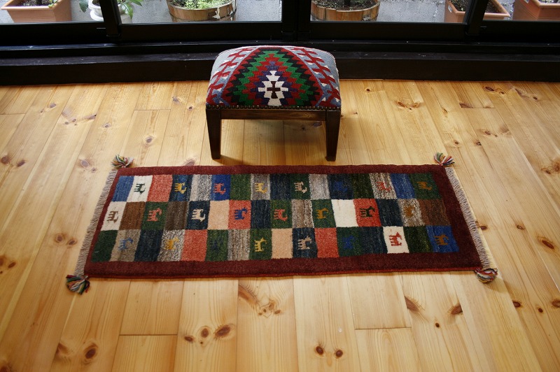 igm112手織り-手紡-草木染め,ギャッベ絨毯とは、イランの遊牧民の女性たちが織るウール100%の手織りの草木染絨毯です。ギャッベ(Gabbeh)は2センチ約の長い毛足を持つ分厚い絨毯のことを指します。100%天然素材ですので、べとつくことなくサラッとし、1年を通して使っていただけます。こちらのサイズは、玄関マットや、ベットの脇や、ソファーの前など、幅広く使っていただけます。