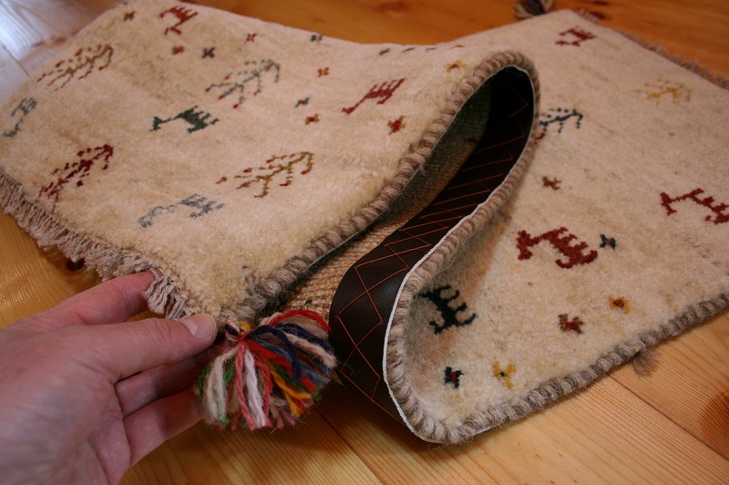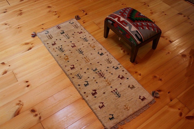 手織り-手紡-草木染め,ギャッベ絨毯とは、イランの遊牧民の女性たちが織るウール100%の手織りの草木染絨毯です。ギャッベ(Gabbeh)は2センチ約の長い毛足を持つ分厚い絨毯のことを指します。100%天然素材ですので、べとつくことなくサラッとし、1年を通して使っていただけます。こちらのサイズは、玄関マットや、ベットの脇や、キッチンマット、ソファーの前など、幅広く使っていただけます。