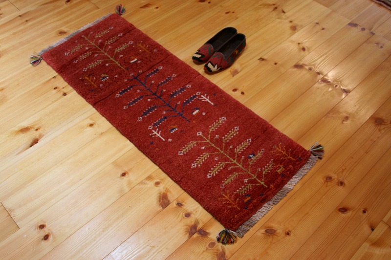 手織り-手紡-草木染め,ギャッベ絨毯とは、イランの遊牧民の女性たちが織るウール100%の手織りの草木染絨毯です。ギャッベ(Gabbeh)は2センチ約の長い毛足を持つ分厚い絨毯のことを指します。100%天然素材ですので、べとつくことなくサラッとし、1年を通して使っていただけます。こちらのサイズは、玄関マットや、ベットの脇や、キッチンマット、ソファーの前など、幅広く使っていただけます。
