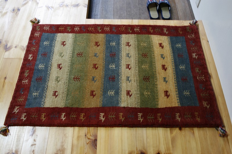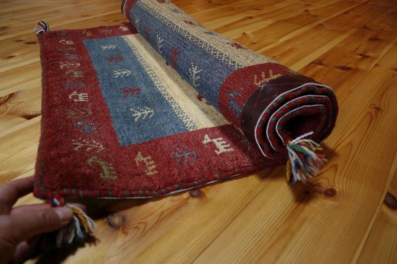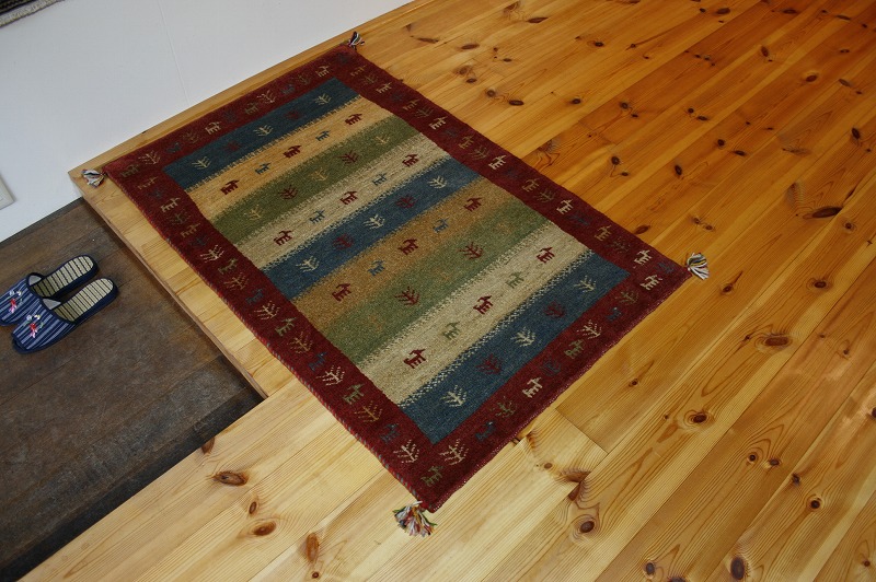 igm139手織り-手紡-草木染め,ギャッベ絨毯とは、イランの遊牧民の女性たちが織るウール100%の手織りの草木染絨毯です。ギャッベ(Gabbeh)は2センチ約の長い毛足を持つ分厚い絨毯のことを指します。100%天然素材ですので、べとつくことなくサラッとし、1年を通して使っていただけます。こちらのサイズは、玄関マットや、ベットの脇や、ソファーの前など、幅広く使っていただけます。