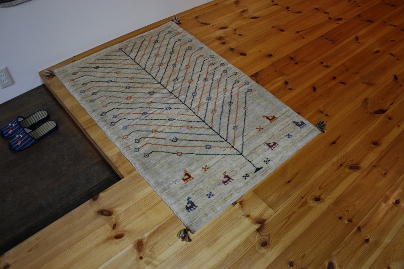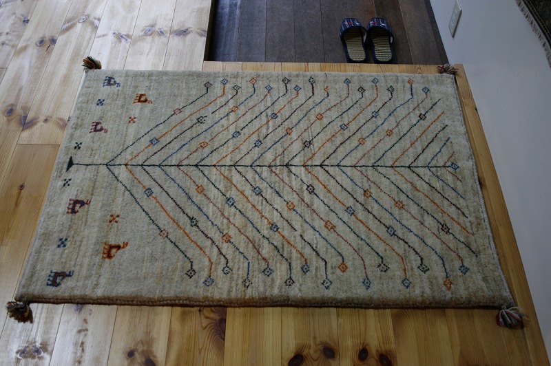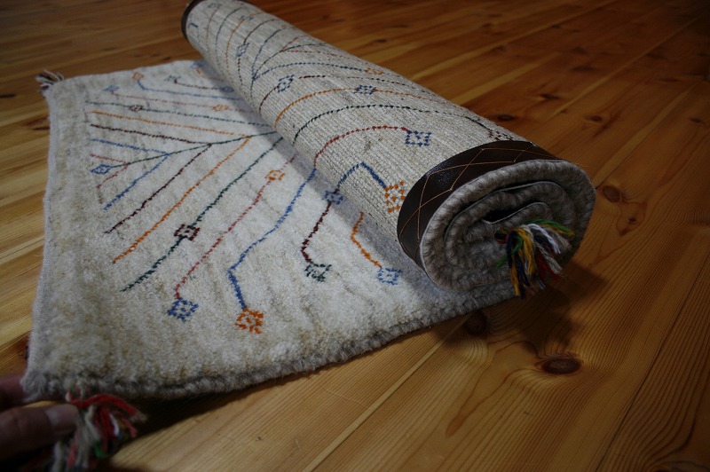 igm153手織り-手紡-草木染め,ギャッベ絨毯とは、イランの遊牧民の女性たちが織るウール100%の手織りの草木染絨毯です。ギャッベ(Gabbeh)は2センチ約の長い毛足を持つ分厚い絨毯のことを指します。100%天然素材ですので、べとつくことなくサラッとし、1年を通して使っていただけます。こちらのサイズは、玄関マットや、ベットの脇や、ソファーの前など、幅広く使っていただけます。