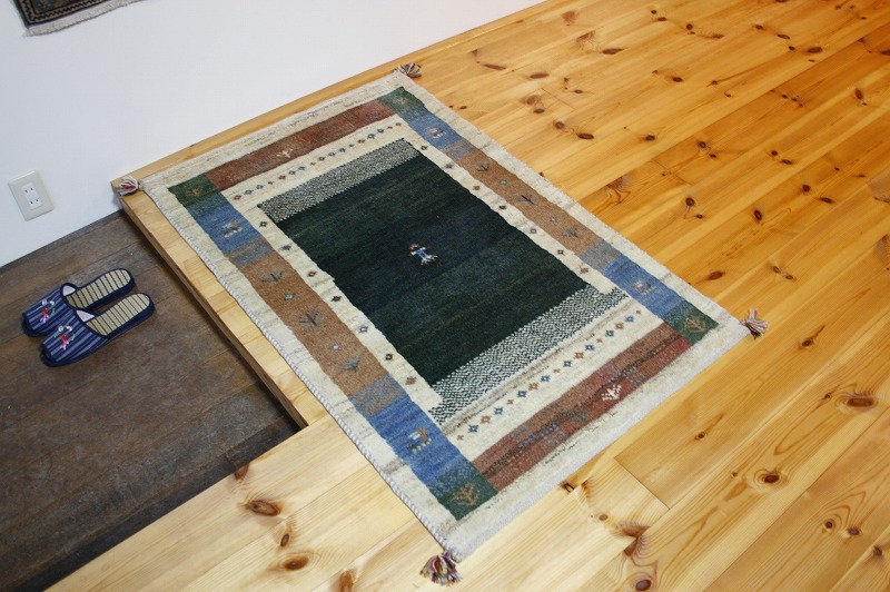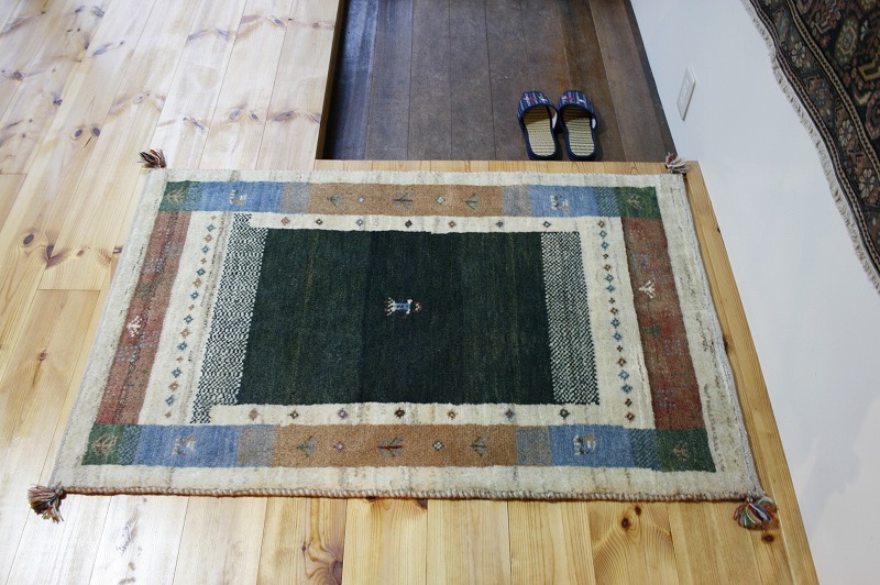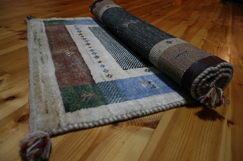 igm163手織り-手紡-草木染め,ギャッベ絨毯とは、イランの遊牧民の女性たちが織るウール100%の手織りの草木染絨毯です。ギャッベ(Gabbeh)は2センチ約の長い毛足を持つ分厚い絨毯のことを指します。100%天然素材ですので、べとつくことなくサラッとし、1年を通して使っていただけます。こちらのサイズは、玄関マットや、ベットの脇や、ソファーの前など、幅広く使っていただけます。