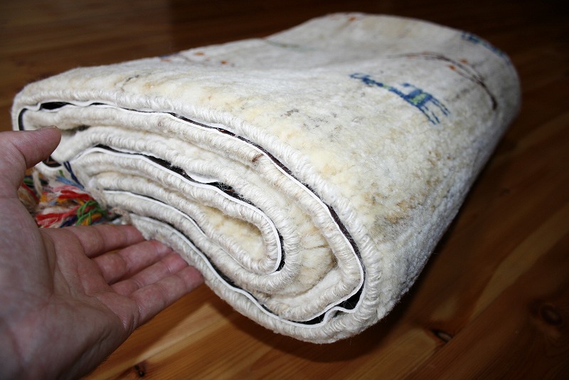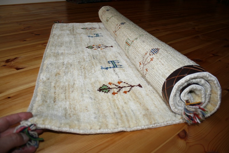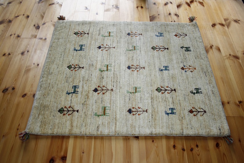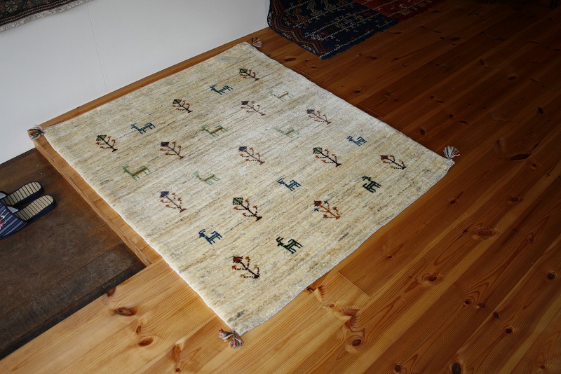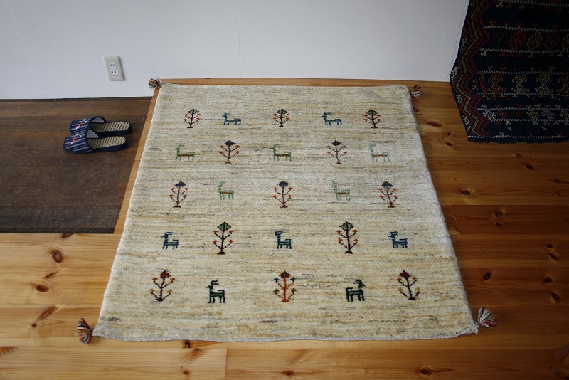 igm173手織り-手紡-草木染め,ギャッベ絨毯とは、イランの遊牧民の女性たちが織るウール100%の手織りの草木染絨毯です。ギャッベ(Gabbeh)は2センチ約の長い毛足を持つ分厚い絨毯のことを指します。100%天然素材ですので、べとつくことなくサラッとし、1年を通して使っていただけます。こちらのサイズは、玄関マットや、ベットの脇や、ソファーの前など、幅広く使っていただけます。