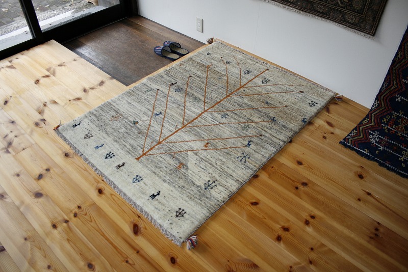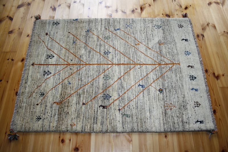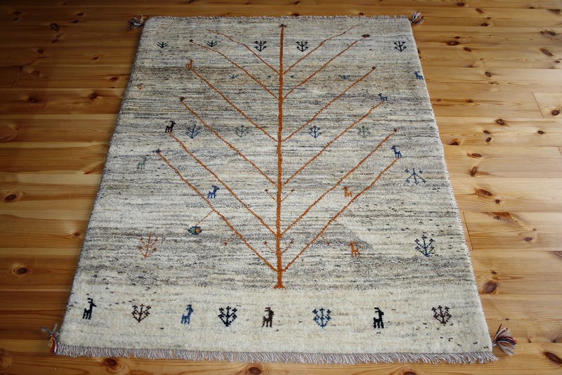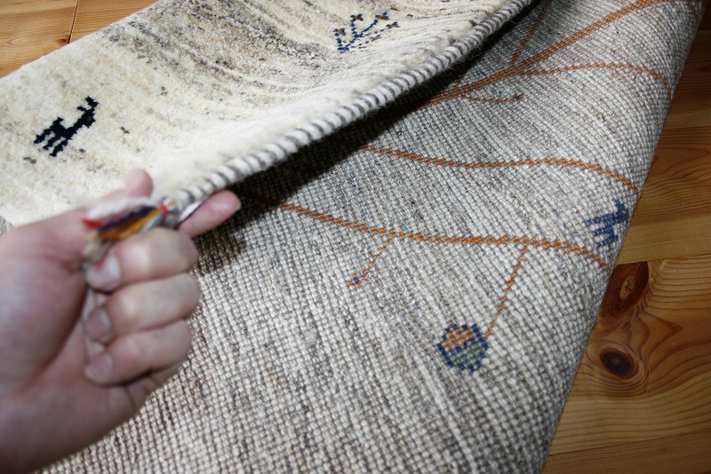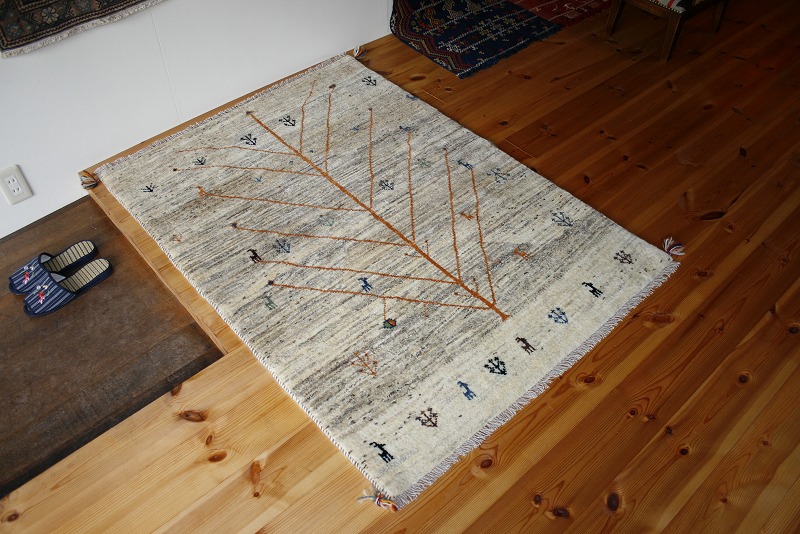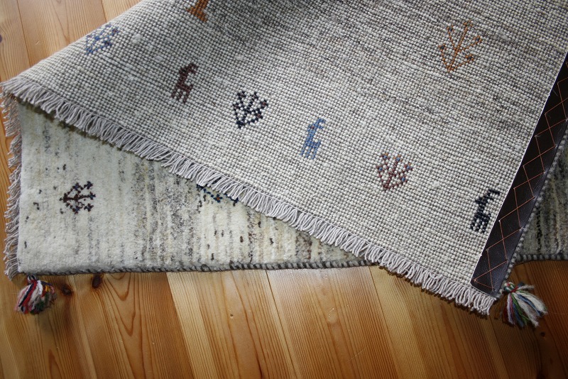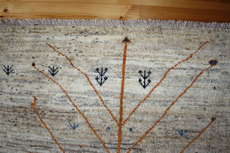 igm194手織り-手紡-草木染め,ギャッベ絨毯とは、イランの遊牧民の女性たちが織るウール100%の手織りの草木染絨毯です。ギャッベ(Gabbeh)は2センチ約の長い毛足を持つ分厚い絨毯のことを指します。100%天然素材ですので、べとつくことなくサラッとし、1年を通して使っていただけます。こちらのサイズは、玄関マットや、ベットの脇や、ソファーの前など、幅広く使っていただけます。