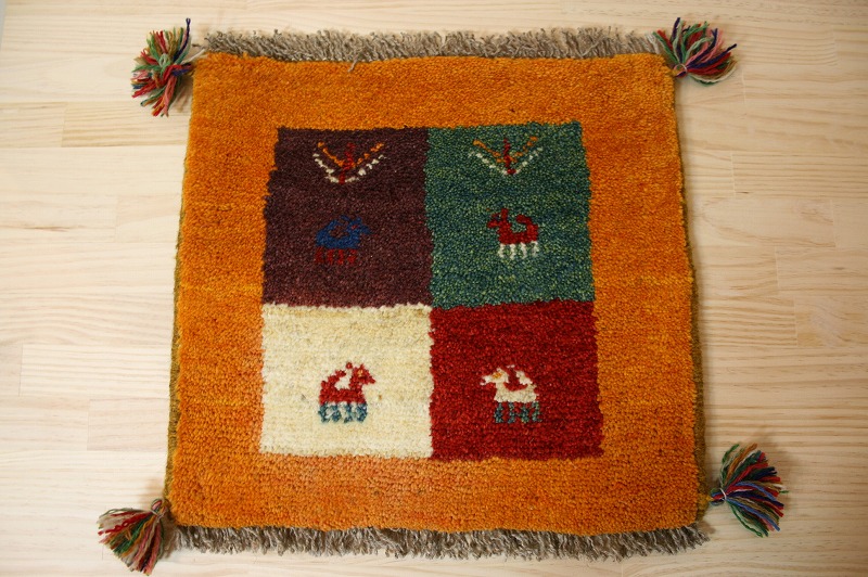 手織り-手紡-草木染め,ギャッベ絨毯とは、イランの遊牧民の女性たちが織るウール100%の手織りの草木染絨毯です。ギャッベ(Gabbeh)は2センチ約の長い毛足を持つ分厚い絨毯のことを指します。100%天然素材ですので、べとつくことなくサラッとし、1年を通して使っていただけます。40cm角のミニサイズは、玄関、ダイニングや普段座る椅子、車の座席の座布団代わりにおすすめです。手織りならではの一枚一枚違った感触をお楽しみください。