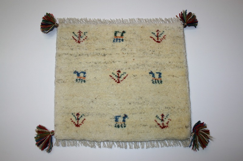手織り-手紡-草木染め,ギャッベ絨毯とは、イランの遊牧民の女性たちが織るウール100%の手織りの草木染絨毯です。ギャッベ(Gabbeh)は2センチ約の長い毛足を持つ分厚い絨毯のことを指します。100%天然素材ですので、べとつくことなくサラッとし、1年を通して使っていただけます。40cm角のミニサイズは、玄関、ダイニングや普段座る椅子、車の座席の座布団代わりにおすすめです。手織りならではの一枚一枚違った感触をお楽しみください。
