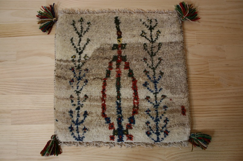 手織り-手紡-草木染め,ギャッベ絨毯とは、イランの遊牧民の女性たちが織るウール100%の手織りの草木染絨毯です。ギャッベ(Gabbeh)は2センチ約の長い毛足を持つ分厚い絨毯のことを指します。100%天然素材ですので、べとつくことなくサラッとし、1年を通して使っていただけます。40cm角のミニサイズは、玄関、ダイニングや普段座る椅子、車の座席の座布団代わりにおすすめです。手織りならではの一枚一枚違った感触をお楽しみください。