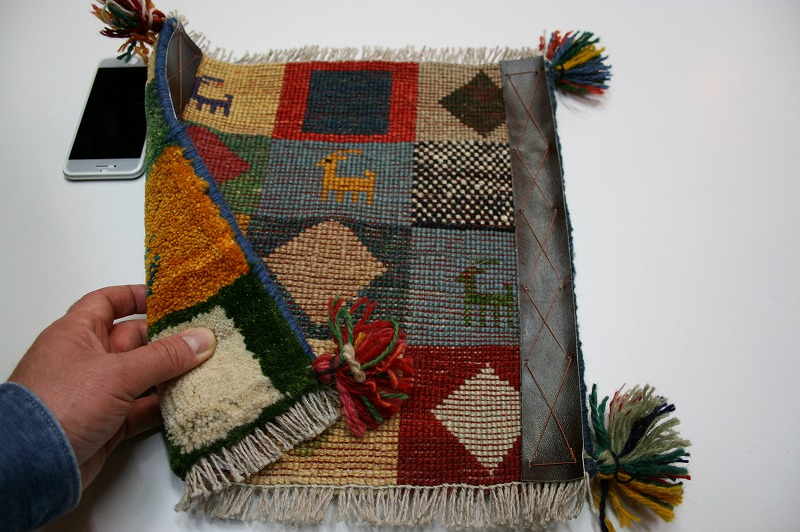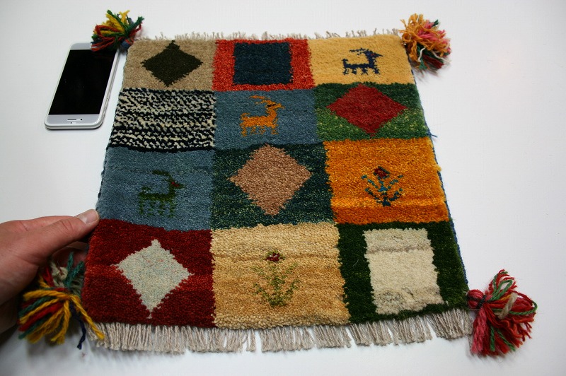 igm43=ふわふわした毛足(パイル)で、手触りがいい手紬で手織りのギャッベ。40cm角のミニサイズは、玄関、ダイニングや普段座る椅子、車の座席の座布団代わりにおすすめです。手織りならではの一枚一枚違った感触をお楽しみください。