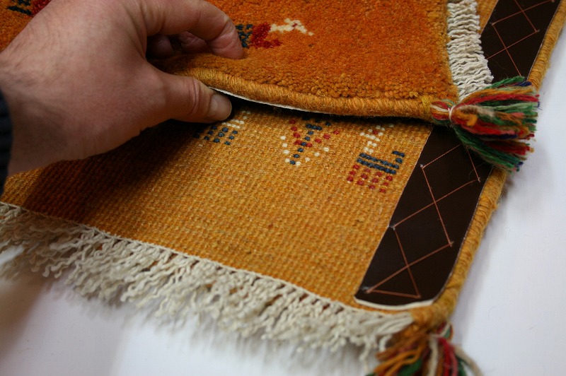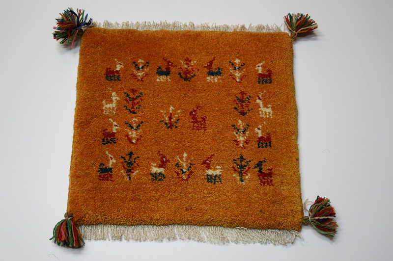手織り-手紡-草木染め,ギャッベ絨毯とは、イランの遊牧民の女性たちが織るウール100%の手織りの草木染絨毯です。ギャッベ(Gabbeh)は2センチ約の長い毛足を持つ分厚い絨毯のことを指します。100%天然素材ですので、べとつくことなくサラッとし、1年を通して使っていただけます。40cm角のミニサイズは、玄関、ダイニングや普段座る椅子、車の座席の座布団代わりにおすすめです。手織りならではの一枚一枚違った感触をお楽しみください。