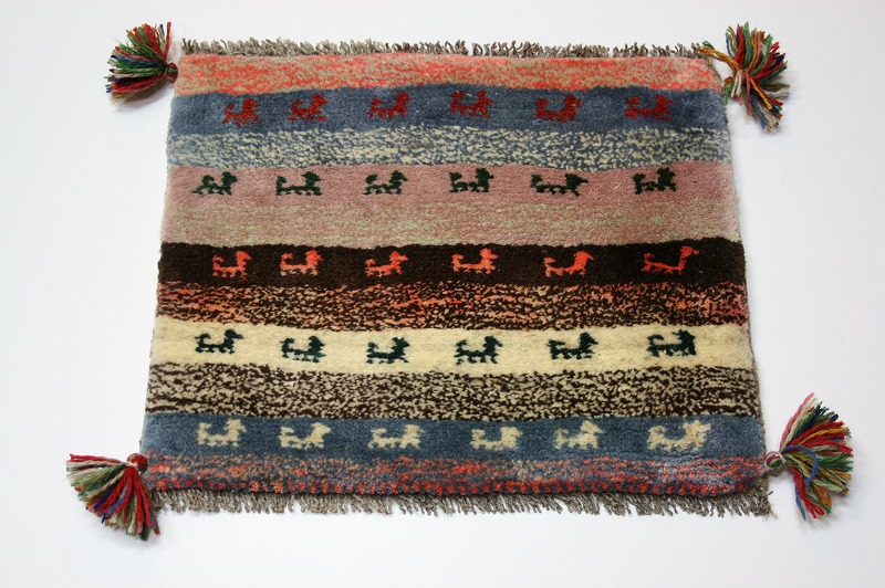 手織り-手紡-草木染め,ギャッベ絨毯とは、イランの遊牧民の女性たちが織るウール100%の手織りの草木染絨毯です。ギャッベ(Gabbeh)は2センチ約の長い毛足を持つ分厚い絨毯のことを指します。100%天然素材ですので、べとつくことなくサラッとし、1年を通して使っていただけます。40cm角のミニサイズは、玄関、ダイニングや普段座る椅子、車の座席の座布団代わりにおすすめです。手織りならではの一枚一枚違った感触をお楽しみください。