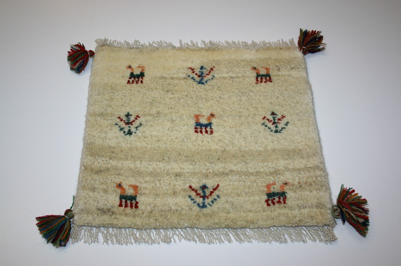 手織り-手紡-草木染め,ギャッベ絨毯とは、イランの遊牧民の女性たちが織るウール100%の手織りの草木染絨毯です。ギャッベ(Gabbeh)は2センチ約の長い毛足を持つ分厚い絨毯のことを指します。100%天然素材ですので、べとつくことなくサラッとし、1年を通して使っていただけます。40cm角のミニサイズは、玄関、ダイニングや普段座る椅子、車の座席の座布団代わりにおすすめです。手織りならではの一枚一枚違った感触をお楽しみください。
