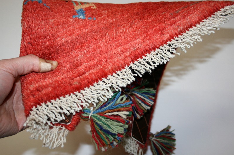 手織り-手紡-草木染め,ギャッベ絨毯とは、イランの遊牧民の女性たちが織るウール100%の手織りの草木染絨毯です。ギャッベ(Gabbeh)は2センチ約の長い毛足を持つ分厚い絨毯のことを指します。100%天然素材ですので、べとつくことなくサラッとし、1年を通して使っていただけます。40cm角のミニサイズは、玄関、ダイニングや普段座る椅子、車の座席の座布団代わりにおすすめです。手織りならではの一枚一枚違った感触をお楽しみください。