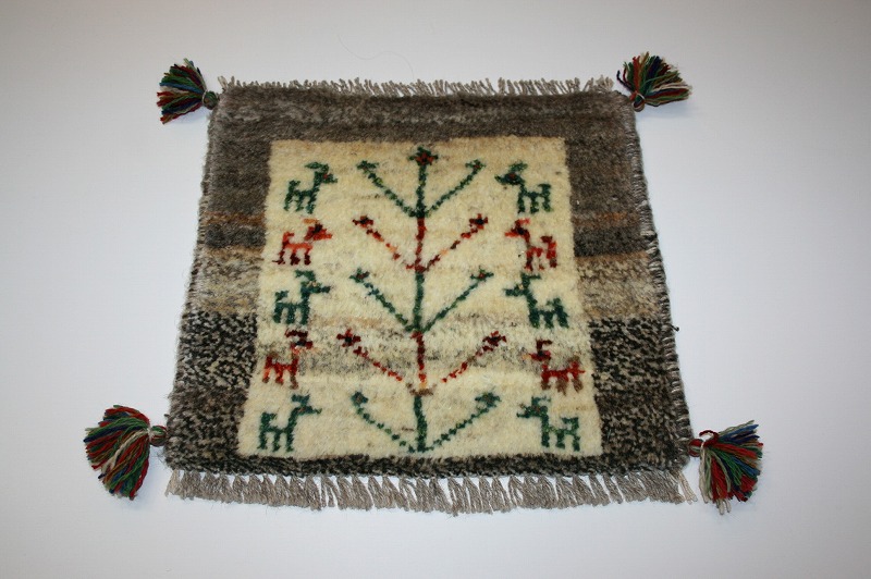 手織り-手紡-草木染め,ギャッベ絨毯とは、イランの遊牧民の女性たちが織るウール100%の手織りの草木染絨毯です。ギャッベ(Gabbeh)は2センチ約の長い毛足を持つ分厚い絨毯のことを指します。100%天然素材ですので、べとつくことなくサラッとし、1年を通して使っていただけます。40cm角のミニサイズは、玄関、ダイニングや普段座る椅子、車の座席の座布団代わりにおすすめです。手織りならではの一枚一枚違った感触をお楽しみください。