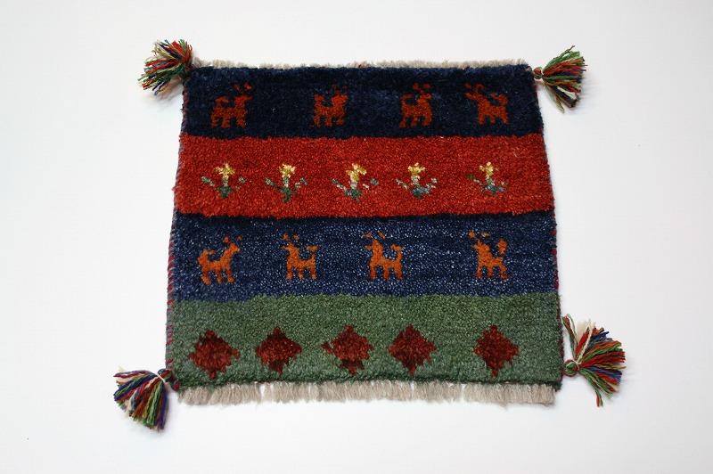 手織り-手紡-草木染め,ギャッベ絨毯とは、イランの遊牧民の女性たちが織るウール100%の手織りの草木染絨毯です。ギャッベ(Gabbeh)は2センチ約の長い毛足を持つ分厚い絨毯のことを指します。100%天然素材ですので、べとつくことなくサラッとし、1年を通して使っていただけます。40cm角のミニサイズは、玄関、ダイニングや普段座る椅子、車の座席の座布団代わりにおすすめです。手織りならではの一枚一枚違った感触をお楽しみください。