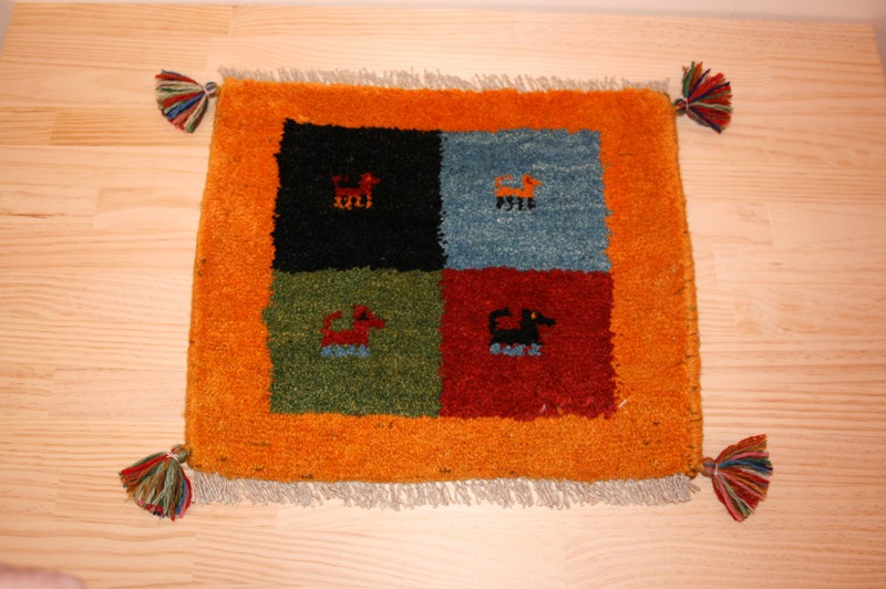 手織り-手紡-草木染め,ギャッベ絨毯とは、イランの遊牧民の女性たちが織るウール100%の手織りの草木染絨毯です。ギャッベ(Gabbeh)は2センチ約の長い毛足を持つ分厚い絨毯のことを指します。100%天然素材ですので、べとつくことなくサラッとし、1年を通して使っていただけます。40cm角のミニサイズは、玄関、ダイニングや普段座る椅子、車の座席の座布団代わりにおすすめです。手織りならではの一枚一枚違った感触をお楽しみください。