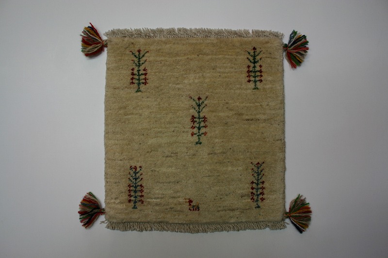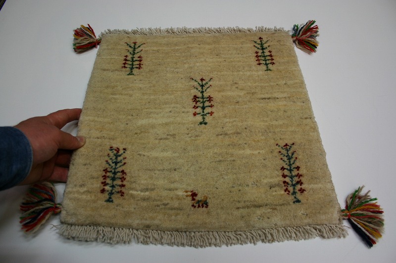 igm60=スペシャルファインギャッベ,ふわふわした毛足(パイル)で、手触りがいい手紬で手織りのギャッベ。40cm角のミニサイズは、玄関、ダイニングや普段座る椅子、車の座席の座布団代わりにおすすめです。手織りならではの一枚一枚違った感触をお楽しみください。