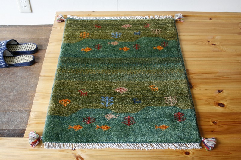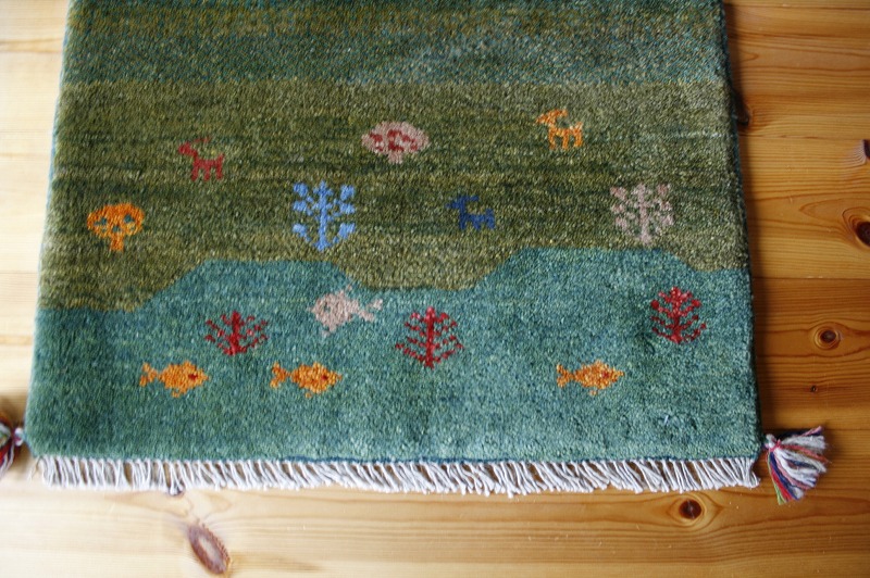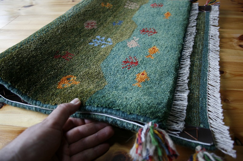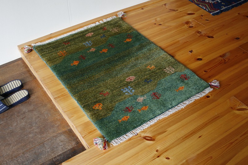igm75手織り-手紡-草木染め,ギャッベ絨毯とは、イランの遊牧民の女性たちが織るウール100%の手織りの草木染絨毯です。ギャッベ(Gabbeh)は2センチ約の長い毛足を持つ分厚い絨毯のことを指します。100%天然素材ですので、べとつくことなくサラッとし、1年を通して使っていただけます。こちらのサイズは、玄関マットや、ベットの脇や、ソファーの前など、幅広く使っていただけます。