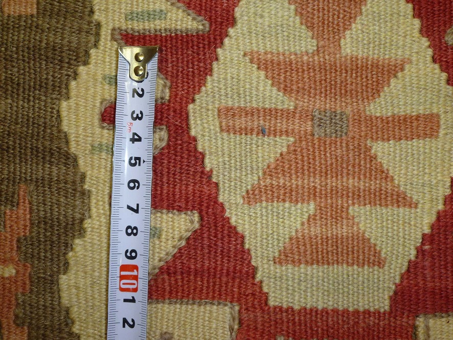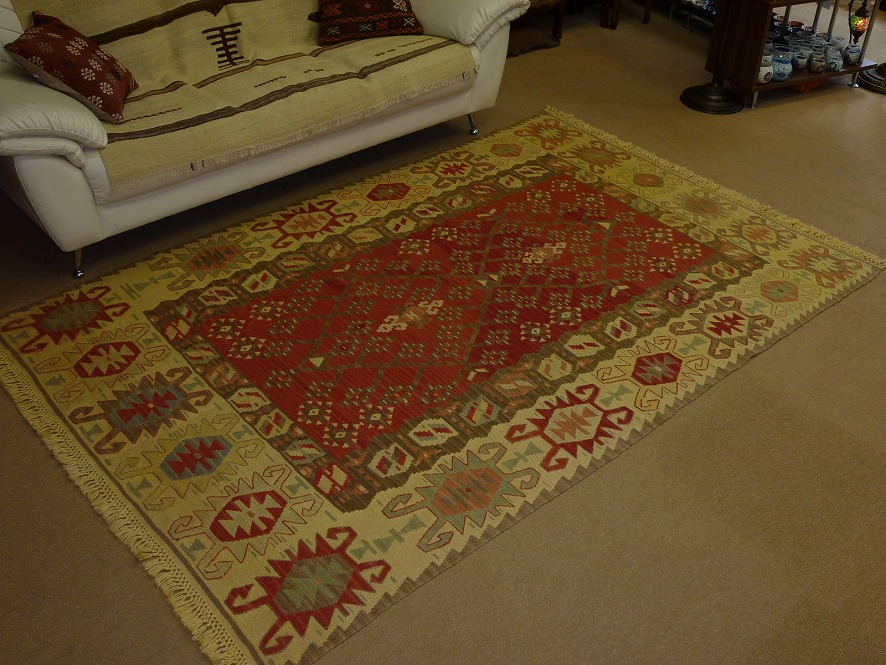 スタンダードキリムより、ワンランク上のカイセリキリム。カイセリ地方で織られているキリムです。上質のウールで織られているため、手触りもやわら か。細かなモチーフがぎっしり詰め込まれ、繊細に織られていて、古いキリムの色合いに合わせたパステル調の色合いが特徴です。機械織りとは異なり、暖かみ が伝わるハンドメイド。このタイプのものは、なかなか数が少なく、品質・価格・品揃え共に、日本国内屈指で あると自負しています。