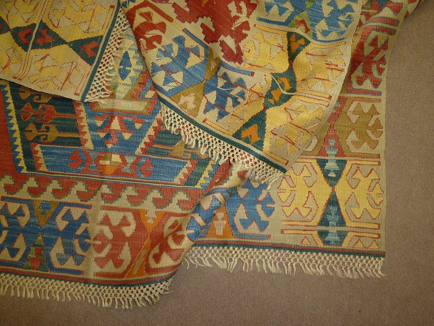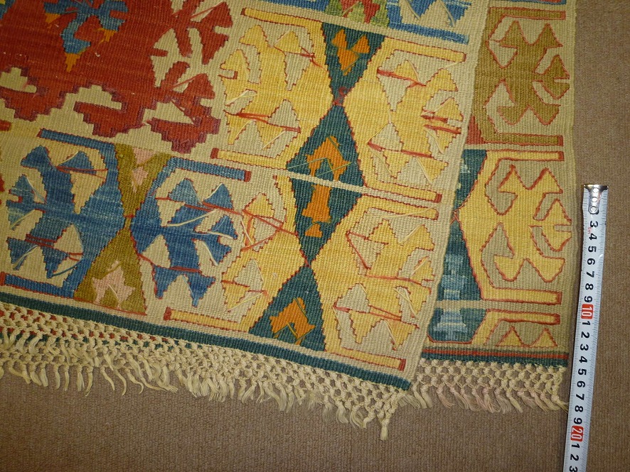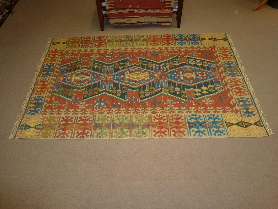 スタンダードキリムより、ワンランク上のカイセリキリム。カイセリ地方で織られているキリムです。上質のウールで織られているため、手触りもやわらか。細かなモチーフがぎっしり詰め込まれ、繊細に織られていて、古いキリムの色合いに合わせたパステル調の色合いが特徴です。機械織りとは異なり、暖かみが伝わるハンドメイド。このタイプのものは、なかなか数が少なく、品質・価格・品揃え共に、日本国内屈指であると自負しています。