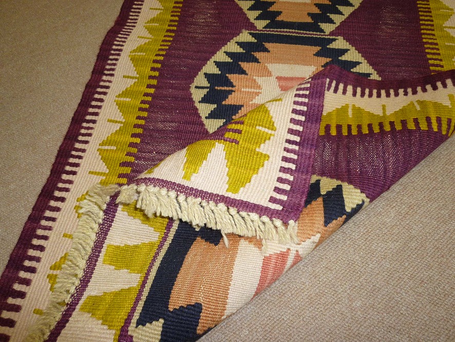 スタンダードキリムより、ワンランク上のカイセリキリム。カイセリ地方で織られているキリムです。上質のウールで織られているため、手触りもやわら か。細かなモチーフがぎっしり詰め込まれ、繊細に織られていて、古いキリムの色合いに合わせたパステル調の色合いが特徴です。機械織りとは異なり、暖かみ が伝わるハンドメイド。このタイプのものは、なかなか数が少なく、品質・価格・品揃え共に、日本国内屈指で あると自負しています。
