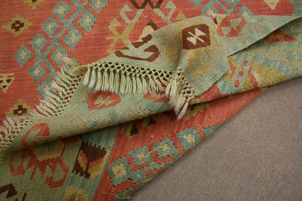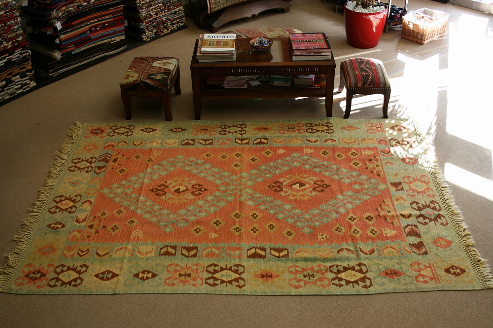 スタンダードキリムより、ワンランク上のカイセリキリム。カイセリ地方で織られているキリムです。上質のウールで織られているため、手触りもやわらか。細かなモチーフがぎっしり詰め込まれ、繊細に織られていて、古いキリムの色合いに合わせたパステル調の色合いが特徴です。機械織りとは異なり、暖かみが伝わるハンドメイド。このタイプのものは、なかなか数が少なく、品質・価格・品揃え共に、日本国内屈指であると自負しています。